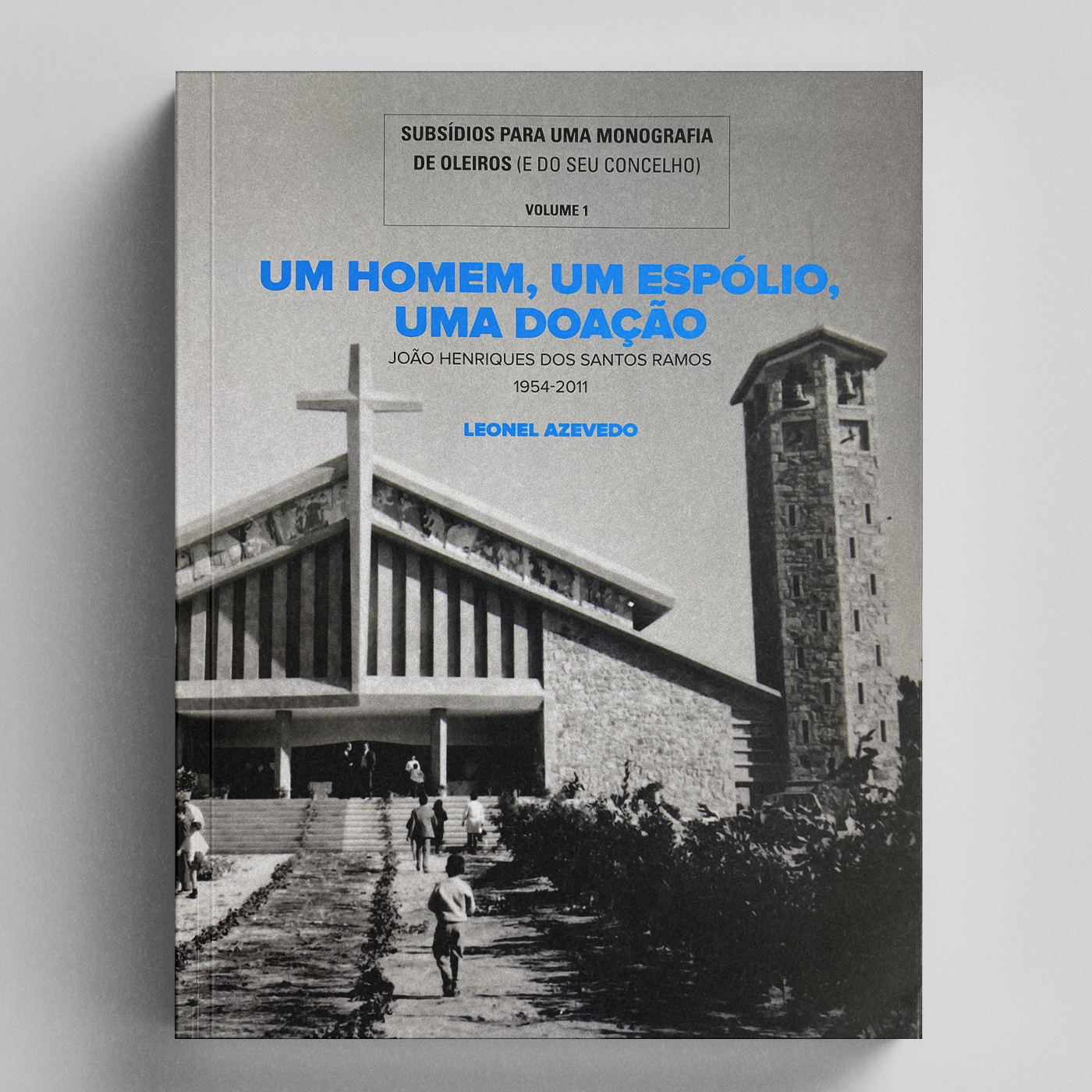 • Capa de livro com fotografia a preto e branco de igreja e texto em azul e preto